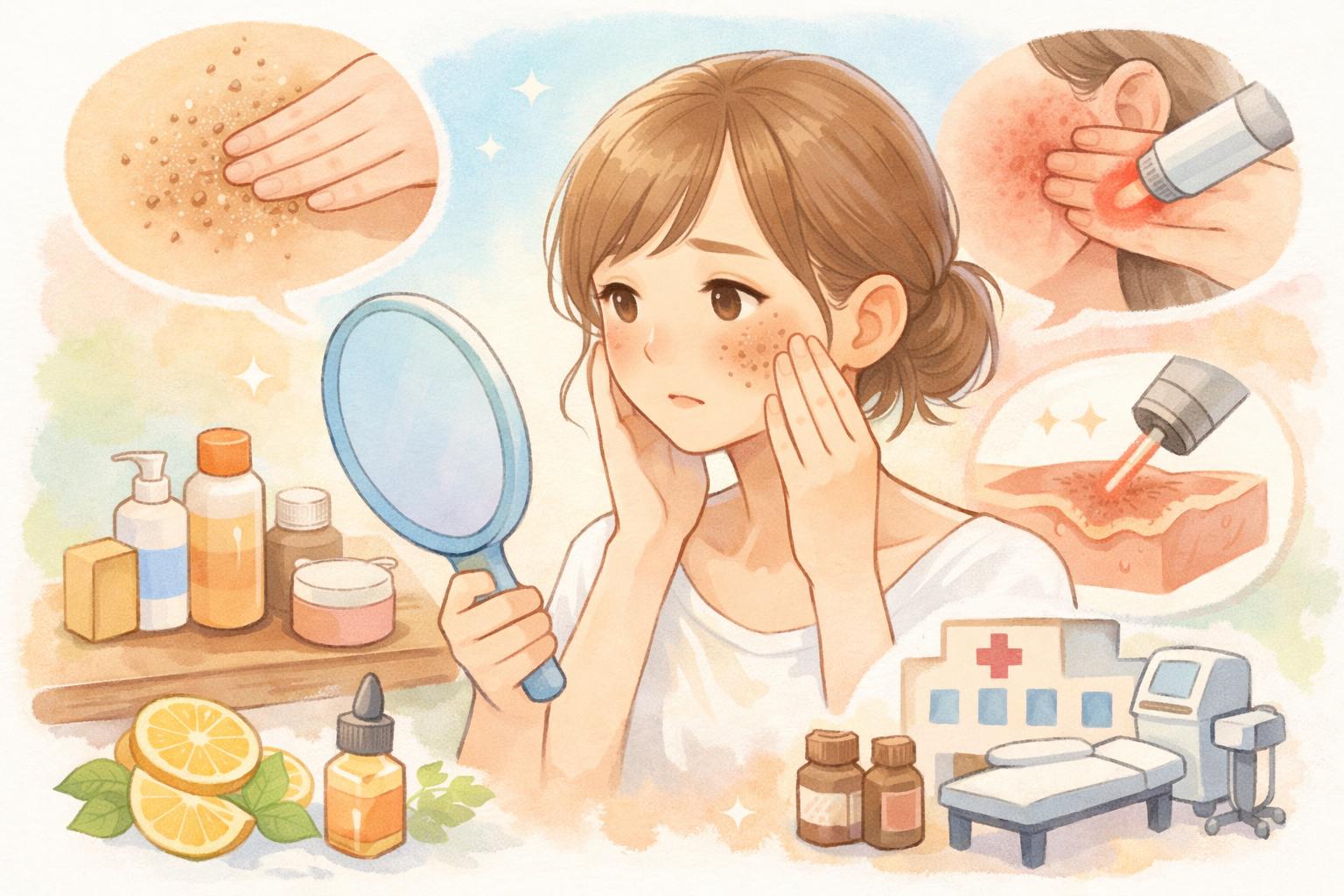 | 根拠のない民間療法 | 効果がない、アレルギー反応、接触皮膚炎、シミの悪化 | 科学的根拠のある、確立された方法を選択する |