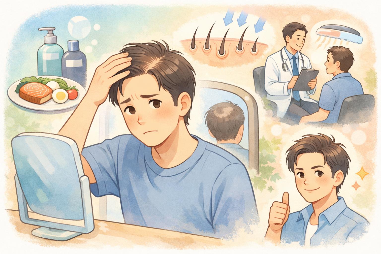 鏡を見るたびに気になる生え際や頭頂部。「もしかして薄毛が進行しているのでは…」と、一人で悩んでいませんか?その悩み、放置すれば深刻化するかもしれません。この記事では、男性の薄毛の主な原因であるAGA(男性型脱毛症)から生活習慣の乱れまでを分かりやすく解説し、今日からすぐに始められる効果的な対策を5つのステップでご紹介します。食事やシャンプーといった日々のセルフケアから、育毛剤の正しい選び方、専門クリニックでの本格治療、さらには薄毛を目立たなくする髪型の工夫まで、あなたの悩みの段階に応じた最適な解決策が必ず見つかります。もう悩むのは終わりにして、自信を取り戻すための一歩を踏み出しましょう。